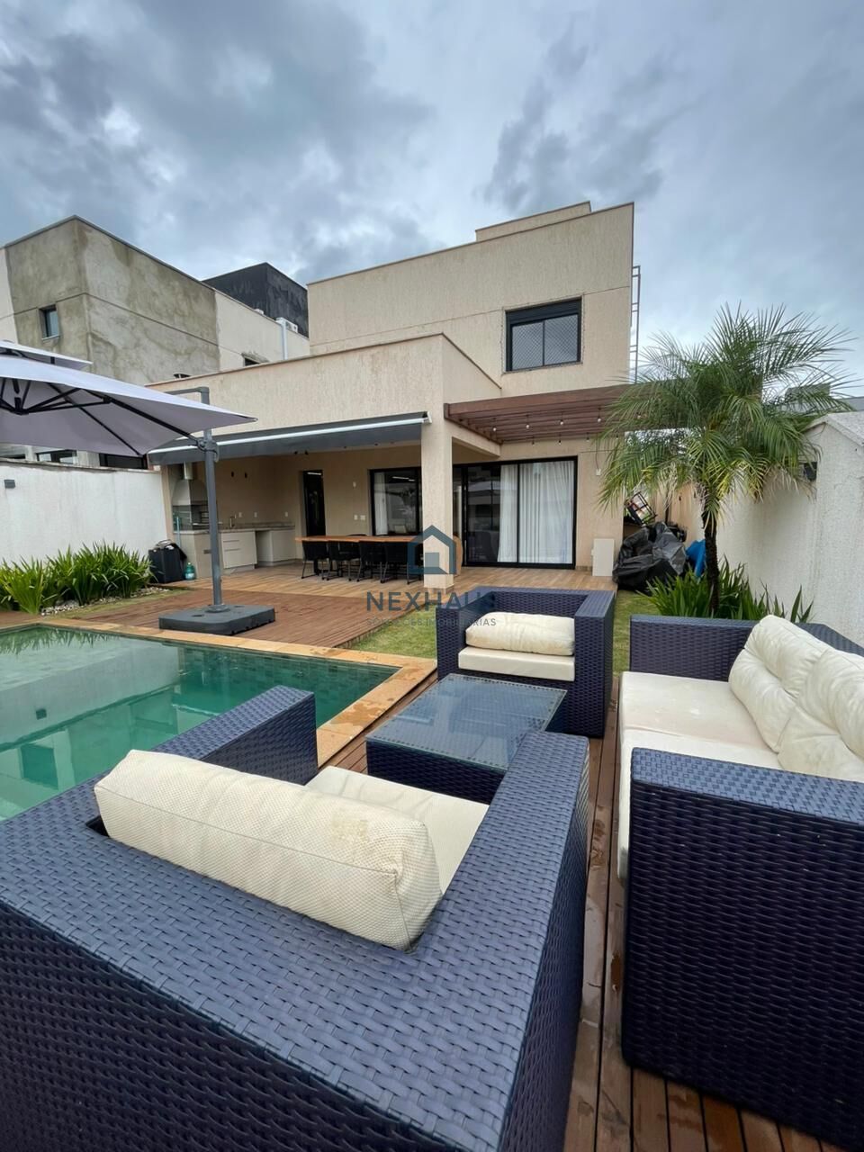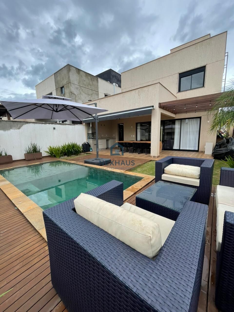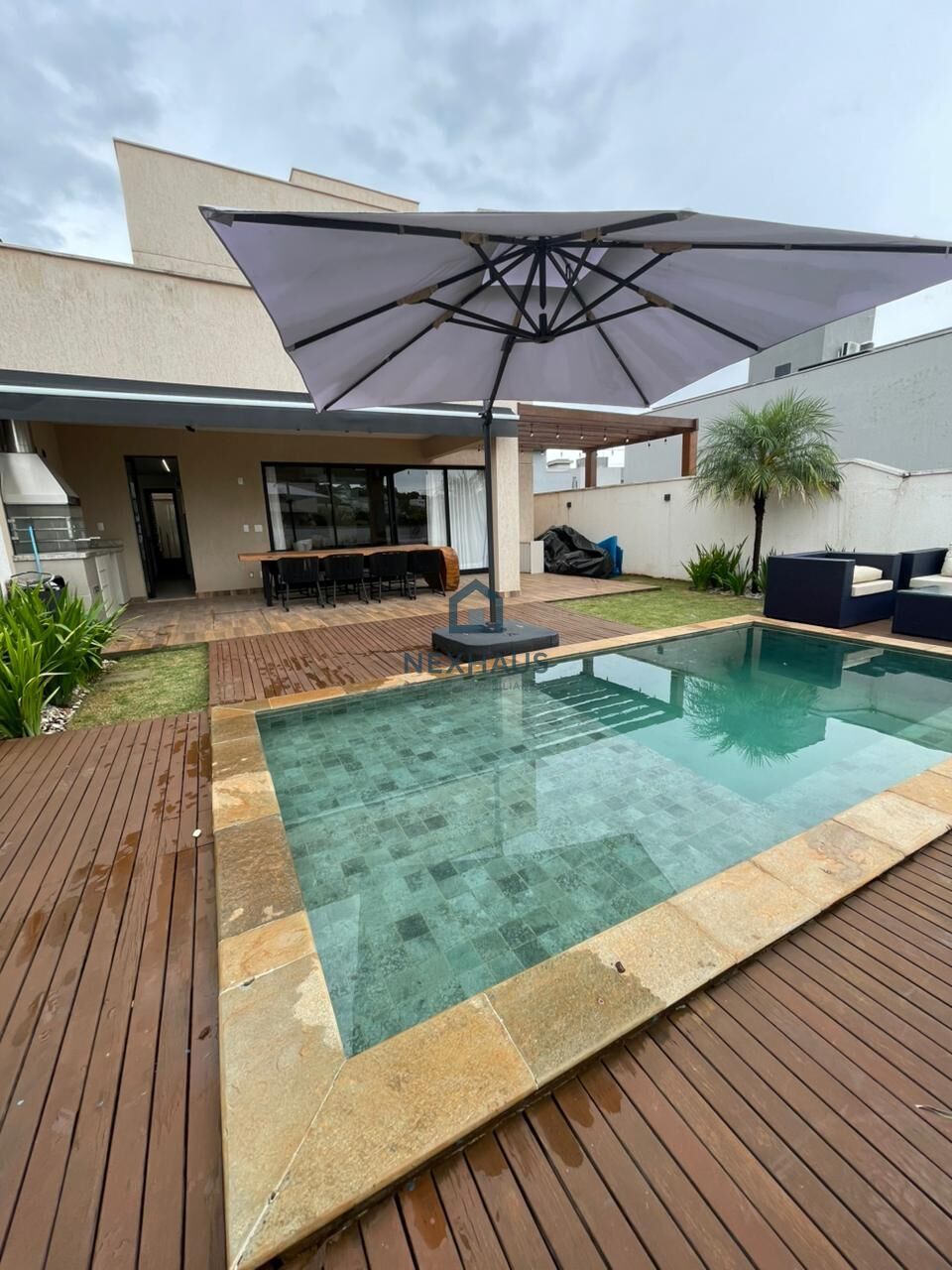 - Area gourmet com deck de madeira, piscina aquecida, churrasqueira e mesa em cascata.